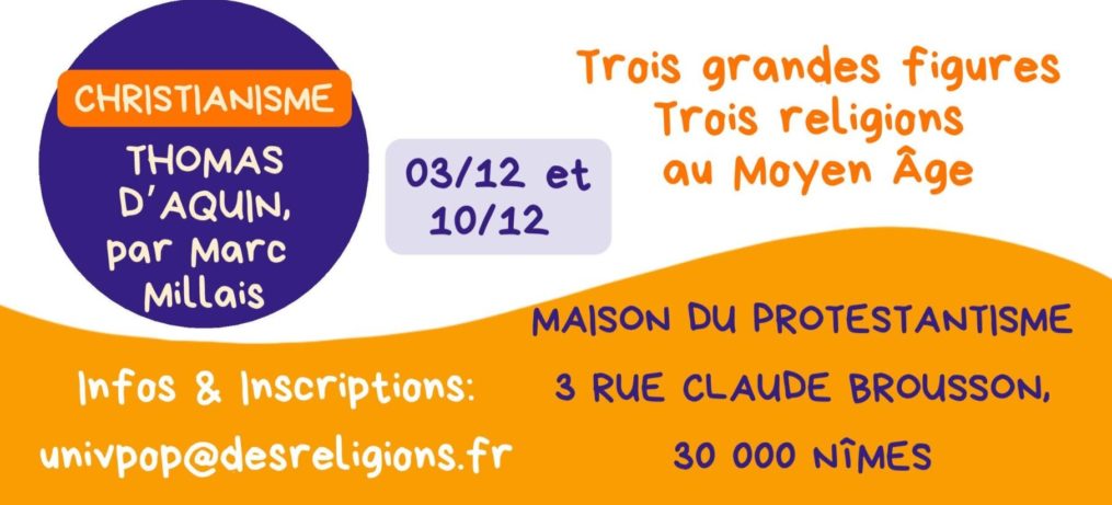 — Maison du Protestantisme (Nîmes), 3 et 10 décembre 2025, Trois grandes figure. Trois religions au Moyen Âge: « Thomas d’Aquin ».